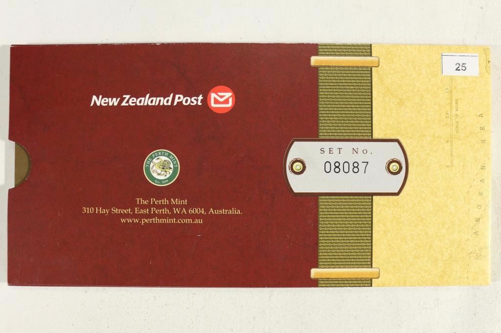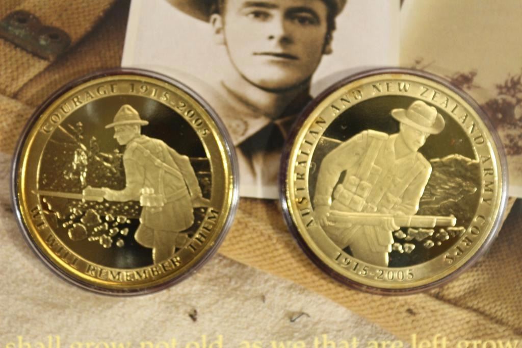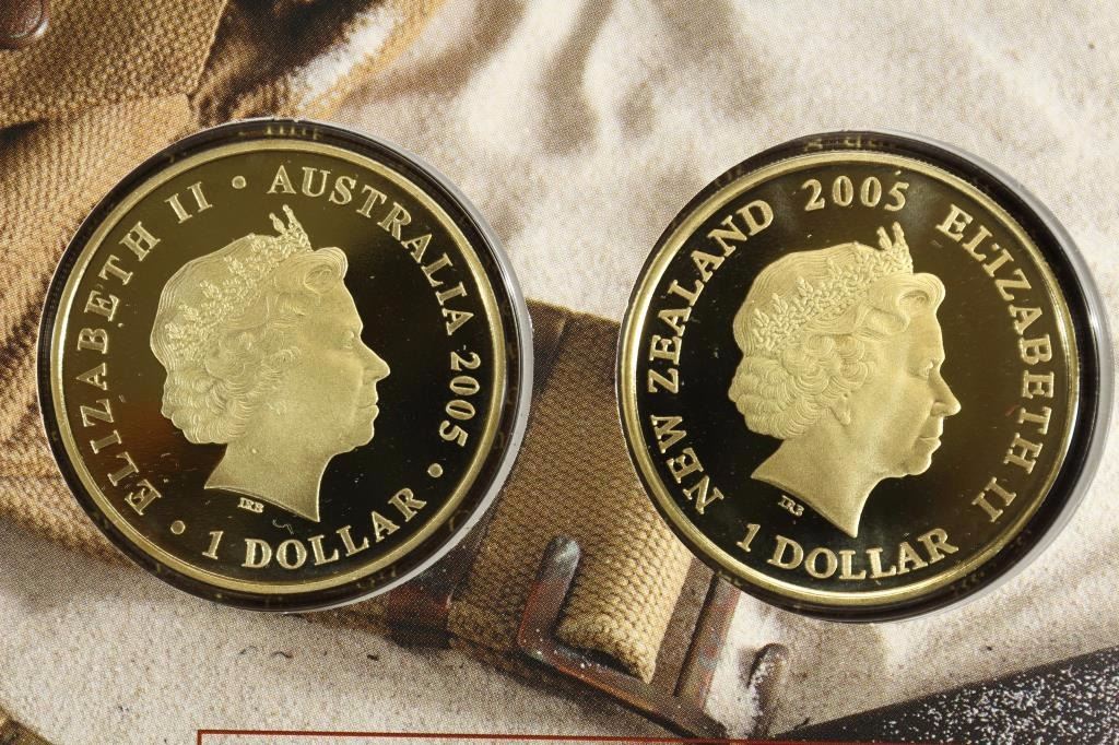 INCLUDES 2 AUSTRALIA $1 PROOF ALUMINUM BRONZE COINS COMMEMORATING THE 90TH ANNIVERSARY OF THE 1ST MAJOR MILITARY ACTION FOUGHT BY THE AUSTRALIA & NEW ZEALAND ARMY CORPS. DURING