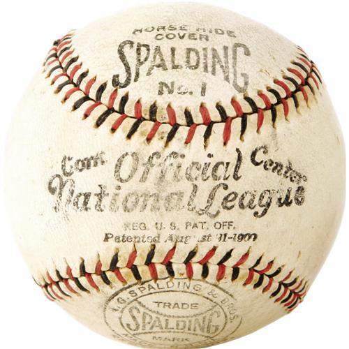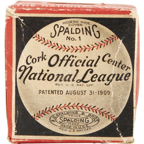 <B>1915-24 Official National League Baseball in Box.</B></I> Far more rare than signed baseballs dating from the game's transition from Dead Ball to Live Ball is the unsigned sphere, so we're pleased to present one for you here. Lack of presidential stamping prohibits us from narrowing the range of dates, but suffice it to say that this is the model used by the likes of Rogers Hornsby, G.C. Alexander and Ross Youngs. Light wear to the ball is evident, but it's unclear if it is from game action or just the natural aging process. Included is the even more scarce original cardboard box, somewhat crushed and creased but still solid and complete.