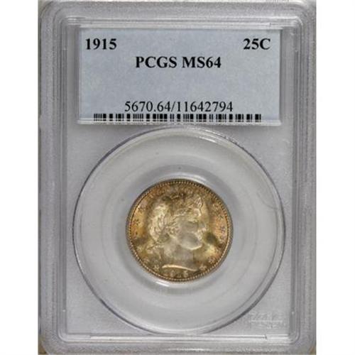 <B>1915 25C MS64 PCGS.</B></I> PCGS Population (137/84). NGC Census: (104/61). Mintage: 3,480,450. Numismedia Wsl. Price for NGC/PCGS coin in MS64: $460. (#5670)<BR><BR><b>Shipping:</b> Coins & Currency (<a target="_blank" href="http://www.heritageauctions.com/common/shipping.php">view shipping information</a>)