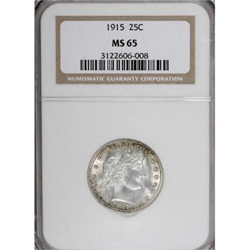 <B>1915 25C MS65 NGC.</B></I> NGC Census: (50/10). PCGS Population (77/13). Mintage: 3,480,450. Numismedia Wsl. Price for NGC/PCGS coin in MS65: $1,050. (#5670)<BR><BR><B>Coin Engraver:</B> Charles E. Barber<BR><BR><b>Shipping:</b> Coins & Currency (<a target="_blank" href="http://www.heritageauctions.com/common/shipping.php">view shipping information</a>)
