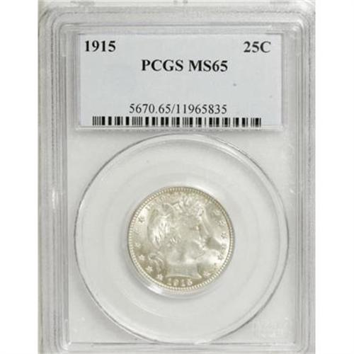 <B>1915 25C MS65 PCGS.</B></I> Delightful luster for this late-date Barber quarter issue with whispers of gray-gold patina at the margins. Pleasing definition and solid preservation create a winning combination. Population: 76 in 65, 13 finer (1/08).<BR><BR><B>Coin Engraver:</B> Charles E. Barber<BR><BR><b>Shipping:</b> Coins & Currency (<a target="_blank" href="http://www.heritageauctions.com/common/shipping.php">view shipping information</a>)
