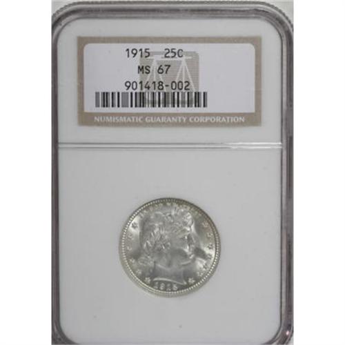 <B>1915 25C MS67 NGC.</B></I> Lovely luster radiates from the satiny, silver surfaces, which are nearly pristine and distraction-free. A boldly struck and delightful Superb Gem, from this next-to-last year of the Barber design. The only one so certified at either NGC or PCGS (1/08). A must-have for the Registry Set collectors or for a fine type set.<BR><I>From The Southwest Collection.</B></I><BR><BR><B>Coin Engraver:</B> Charles E. Barber<BR><BR><b>Shipping:</b> Coins & Currency (<a target="_blank" href="http://www.heritageauctions.com/common/shipping.php">view shipping information</a>)