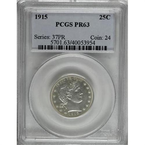 <B>1915 25C PR63 PCGS.</B></I> Sharply struck with considerable eye appeal, an attractive example of this final proof Barber quarter issue. The silver-gray patina that has settled over the moderately reflective surfaces partly camouflages the piece's faint but grade-defining hairlines.<BR><BR><B>Coin Engraver:</B> Charles E. Barber<BR><BR><b>Shipping:</b> Coins & Currency (<a target="_blank" href="http://www.heritageauctions.com/common/shipping.php">view shipping information</a>)