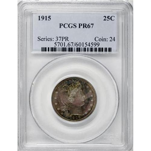 <B>1915 25C PR67 PCGS.</B></I> A medley of green, gold, lilac, violet, and mauve toning runs over virtually pristine surfaces. All of the design elements show a well executed strike, further enhancing this Superb Gem's eye appeal. Population: 8 in 67, 0 finer (11/07).<BR><BR><B>Coin Engraver:</B> Charles E. Barber<BR><BR><b>Shipping:</b> Coins & Currency (<a target="_blank" href="http://www.heritageauctions.com/common/shipping.php">view shipping information</a>)