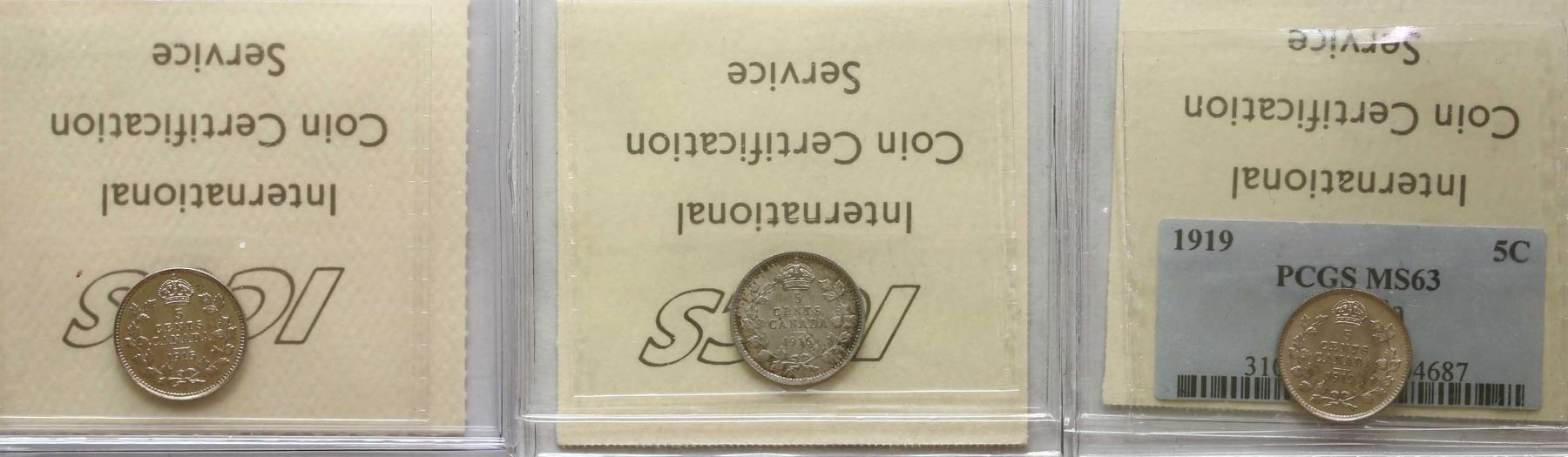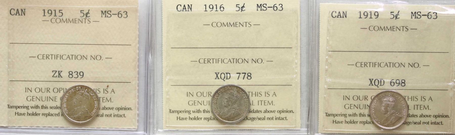 1915 5¢, 1916, 1919 All 3 coins ICCS Choice Mint State-63