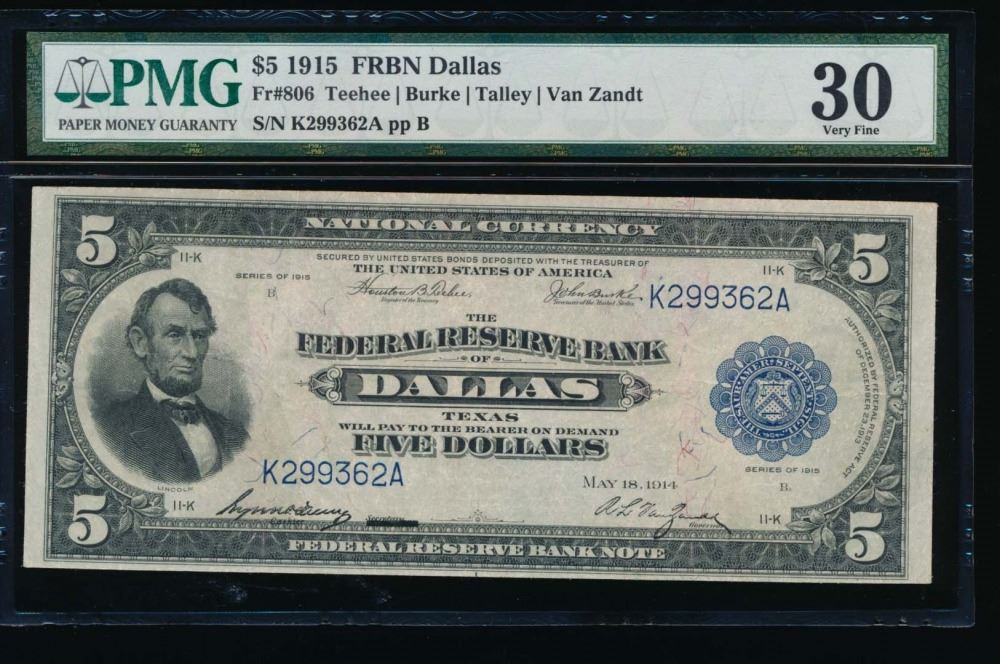 One 1915 $5 Dallas Federal Reserve Bank Note PMG 30.