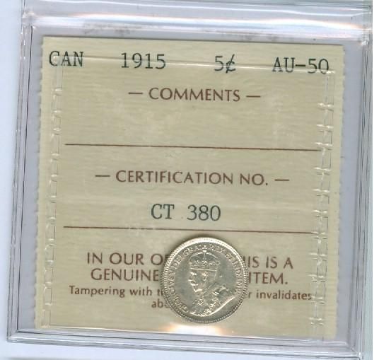 1915 5¢ ICCS AU50. Bright issue with lustre.