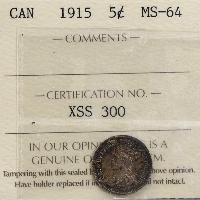 1915 5¢ ICCS Choice Mint State-64 Intense toning over full underlying lustre. Semi-key date.