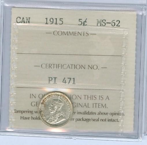 1915 5¢ ICCS MS62. Light golden rim tones.