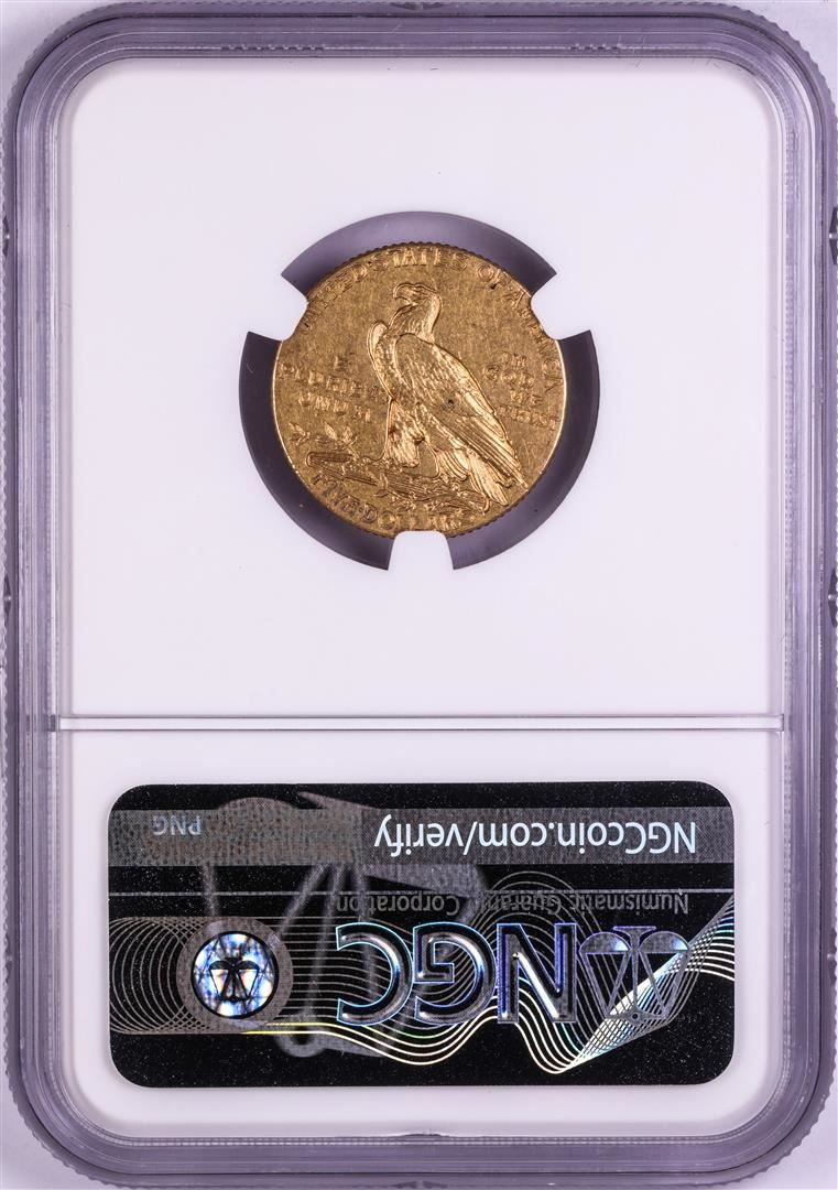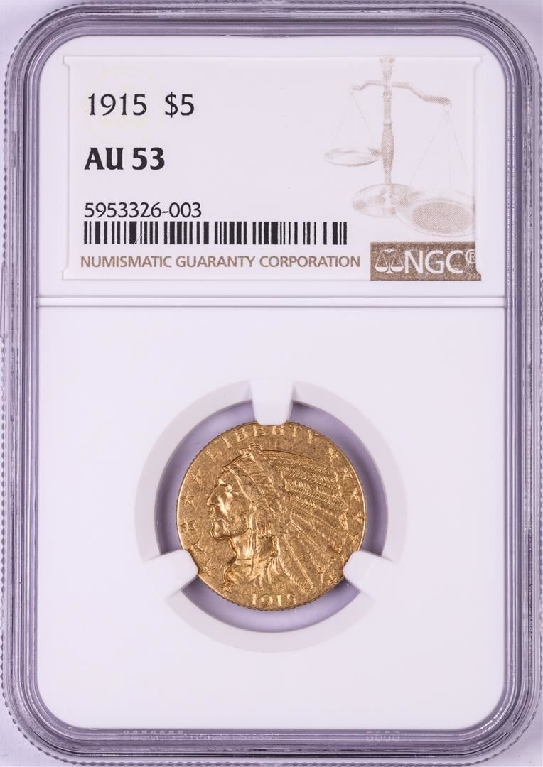 One 1915 $5 Indian Head Half Eagle Gold Coin NGC AU53. NGC Certified.