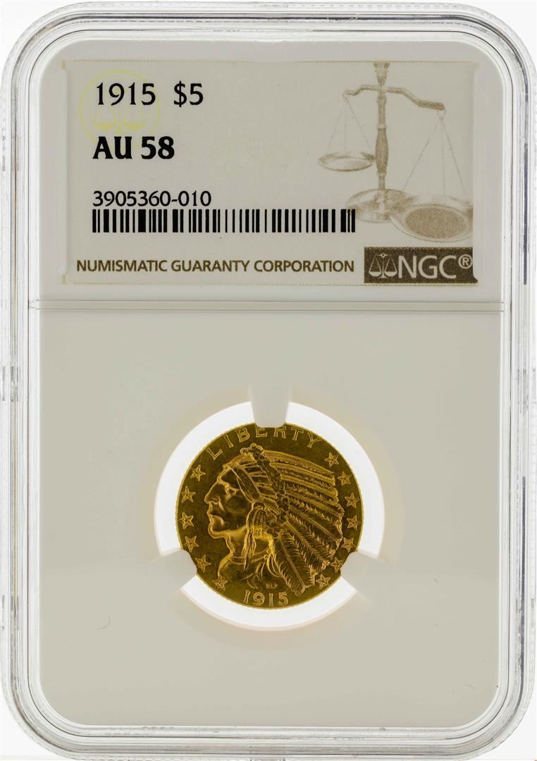 One 1915 $5 Indian Head Half Eagle Gold Coin NGC AU58. NGC Certified.