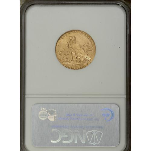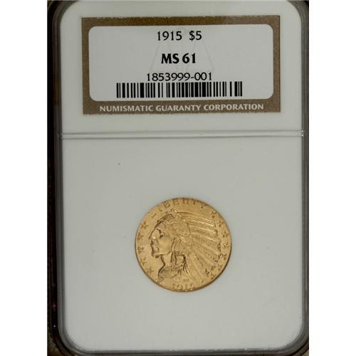 <B>1915 $5 MS61 NGC.</B></I> A robustly struck yellow-orange representative that has bold, atypical luster. The fields of each side have a number of abrasions that restrict the grade.<BR><BR><b>Shipping:</b> Coins & Currency (<a target="_blank" href="http://www.heritageauctions.com/common/shipping.php">view shipping information</a>)