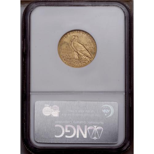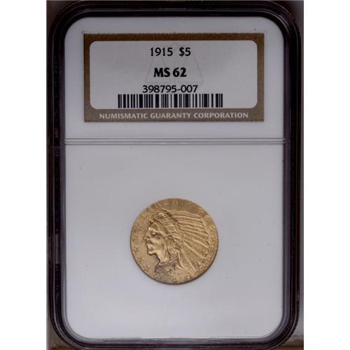 <B>1915 $5 MS62 NGC.</B></I> Good luster and color and an exceptionally bold strike. A couple of contact marks on the Indian's cheek and several field marks on the reverse limit the grade.