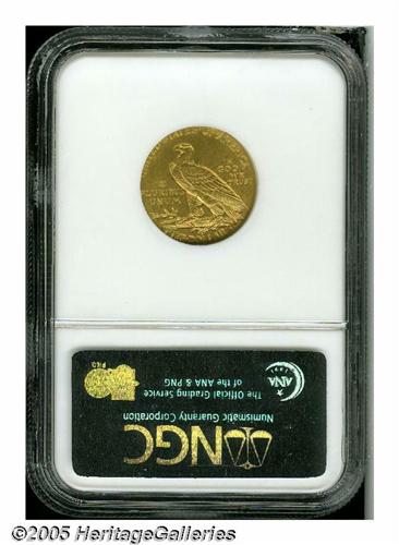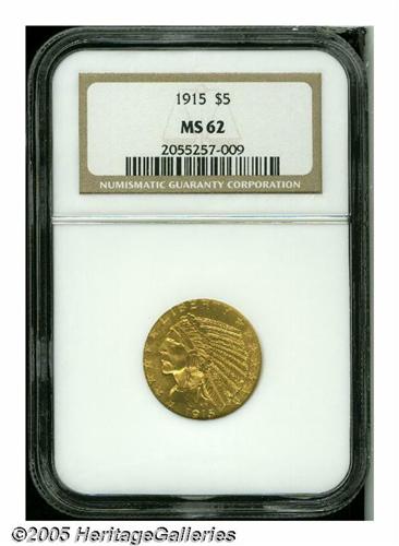 <B>1915<$5> MS62 NGC.</B></I> Honey-gold surfaces display some minute contact marks concealed within the headdress and the eagle's wing feathers. The design features are well impressed, except for minor softness on the eagle's shoulder.