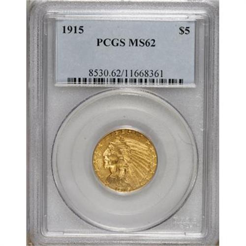 <B>1915 $5 MS62 PCGS.</B></I> The penultimate circulation-strike half eagle issue from Philadelphia, as no more would come from that mint until the final production run in 1929. The softly lustrous yellow-orange fields displays pleasing glints of wheat color. A solidly struck piece that displays a hint of frost on the well-defined devices and few marks for the grade.<BR><BR><b>Shipping:</b> Coins & Currency (<a target="_blank" href="http://www.heritageauctions.com/common/shipping.php">view shipping information</a>)
