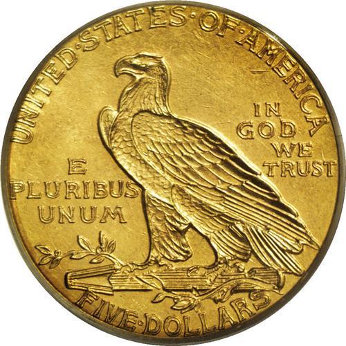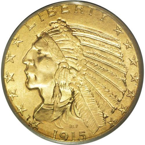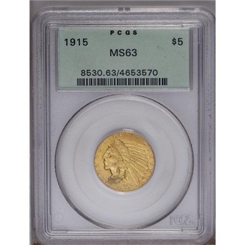 <B>1915 $5 MS63 PCGS.</B></I> Frosty and lustrous with sharp design features and excellent eye appeal. Housed in an old green-label PCGS holder, and clearly an exceptional example for the grade.