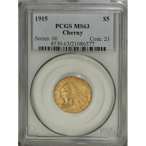 <B>1915 $5 MS63 PCGS.</B></I> The wheat-gold surfaces have traces of orange on the obverse and emerald on the reverse. The devices are suitably impressed, and the lightly abraded fields shine with luster. Overall, the eye appeal of this piece is far above what the grade might suggest, a quality shared by the pieces in this collection.<BR><I>From The Dr. Eugene Cherny Collection of $5 and $10 Indians.</B></I><BR><BR><b>Shipping:</b> Coin/Currency (<a target="_blank" href="http://www.heritageauctions.com/common/shipping.php">view shipping information</a>) <BR><BR><B>Import