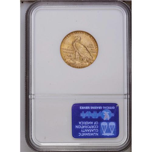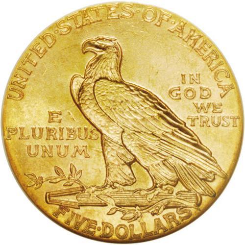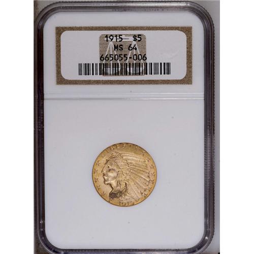 <B>1915<$5> MS64 NGC.</B></I> A sharply struck and highly lustrous near-Gem example with rich yellow-gold color and frosty surfaces. David Akers commented: "the 1915, like all Indian Head half eagles, still must be considered to be rare in MS64 or higher grades." He described this issue as the second most available of all (behind 1908) in Gem condition.