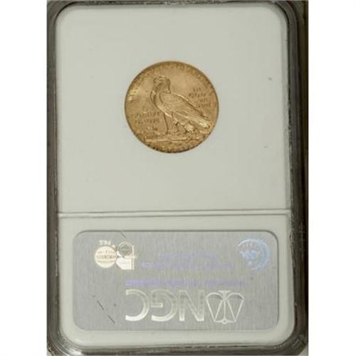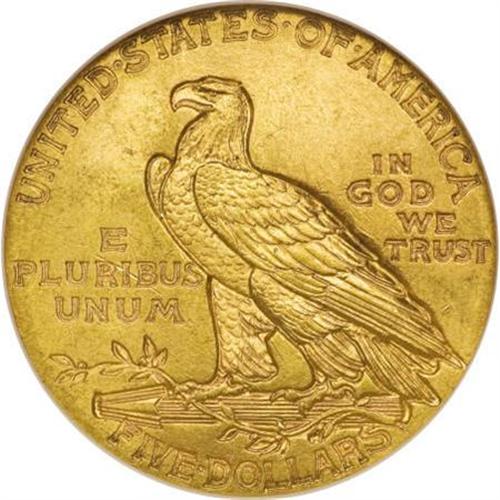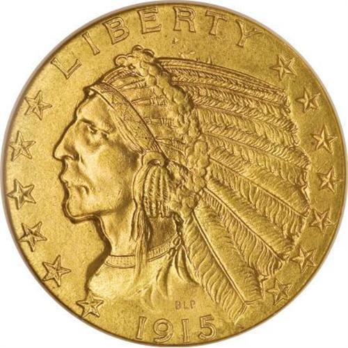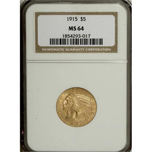 <B>1915 $5 MS64 NGC.</B></I> This shimmering caramel-gold near-Gem has a sharp strike with nearly absolute definition within the Indian's headdress. The few small marks that are present are unworthy of further elaboration. The last of the Philadelphia Mint issues until 1929, since gold coins little circulated on the East Coast by 1915.<BR><BR><B>Coin Engraver:</B> Bela Lyon Pratt<BR><BR><b>Shipping:</b> Coins & Currency (<a target="_blank" href="http://www.heritageauctions.com/common/shipping.php">view shipping information</a>)