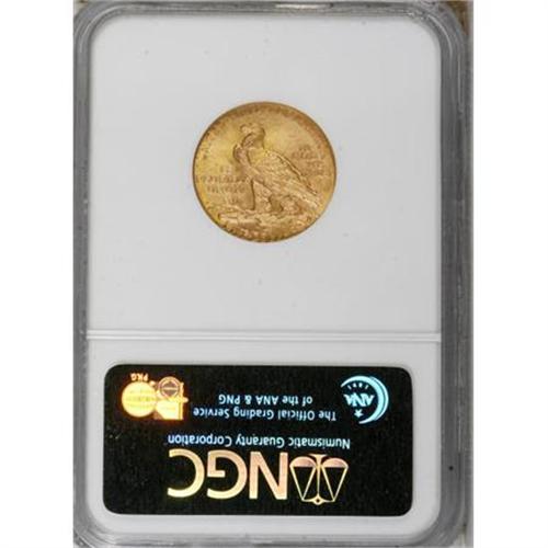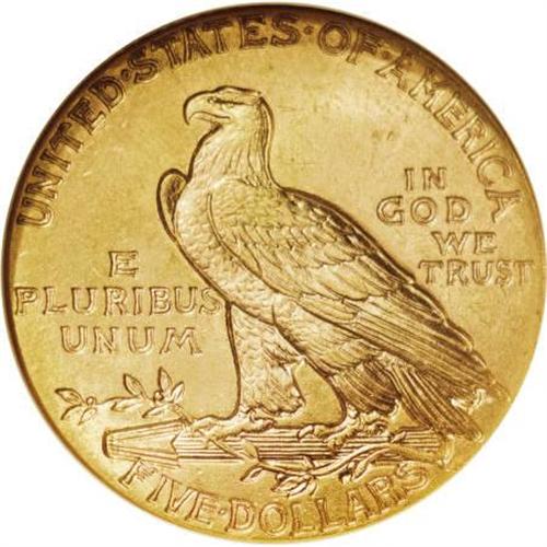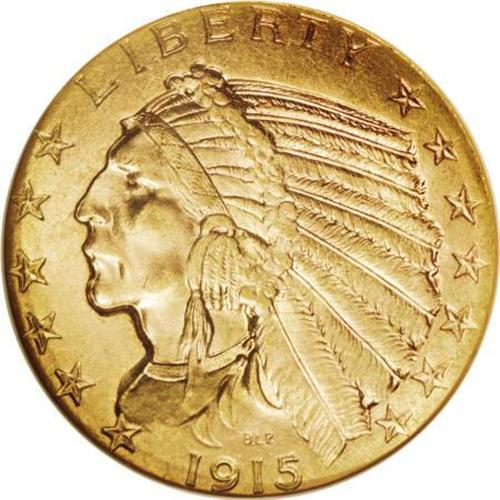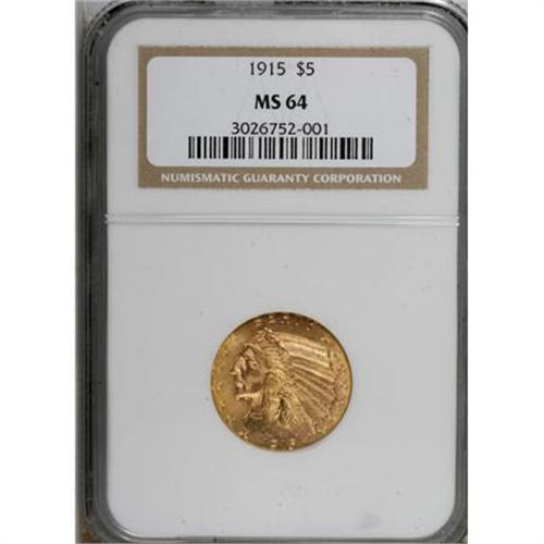 <B>1915 $5 MS64 NGC.</B></I> A charming green-gold near-Gem whose smooth devices and fields provide pleasing eye appeal. Although the lower headdress feathers are sometimes indistinct on this type, the present piece has essentially complete definition throughout. NGC has certified a mere 31 pieces finer (9/07).<BR><BR><B>Coin Engraver:</B> Bela Lyon Pratt<BR><BR><b>Shipping:</b> Coins & Currency (<a target="_blank" href="http://www.heritageauctions.com/common/shipping.php">view shipping information</a>)
