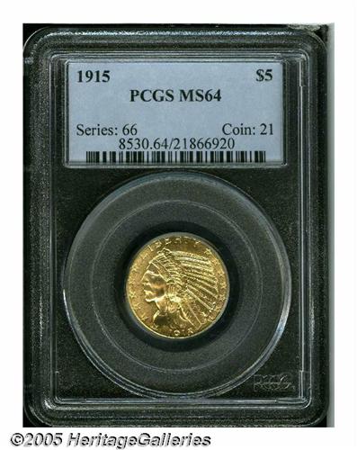 <B>1915<$5> MS64 PCGS.</B></I> A beautiful, exceptionally lustrous coin that appears superior for the grade. Smooth surfaces with satiny luster display a few contact marks on the reverse. A conditionally scarce issue.