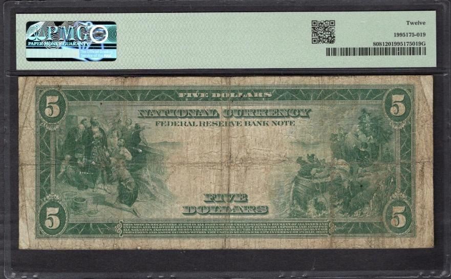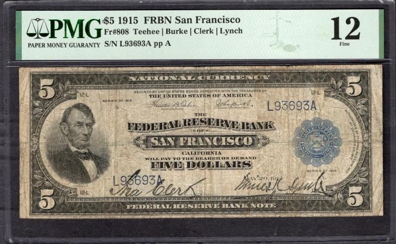 One 1915 $5 San Francisco FRBN PMG 12.
