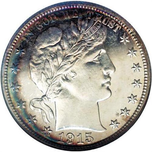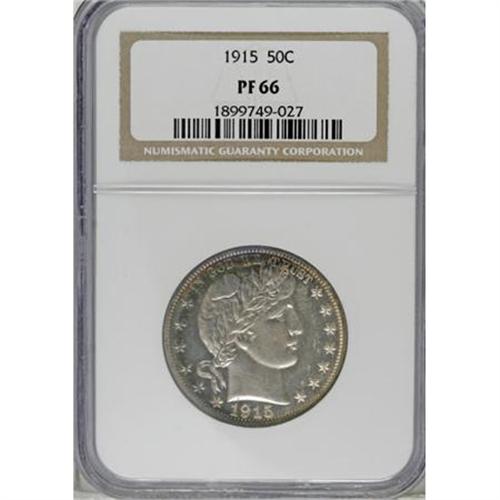 <B>1915 50C PR66 NGC.</B></I> Last of the "Big Three" (1913, 1914, and 1915 P-mints), all with impressively low mintages and scarce in high grades. Proofs, however, bring little premium because of the scarcity of high grade business strikes, but this is an area that collectors should look into more closely. A mere 450 proofs were struck in this year, but a relatively high number were saved in better grades. Thus, this coin would make a fine substitute for the significantly more expensive business strike 1915 in MS66. The fields are deeply mirrored and the centers are brilliant and surrounded by thin bands of lovely iridescent toning at the margins. Census: 21 in 66, 17 finer (11/07).<BR><BR><B>Coin Engraver:</B> Charles E. Barber<BR><BR><b>Shipping:</b> Coins & Currency (<a target="_blank" href="http://www.heritageauctions.com/common/shipping.php">view shipping information</a>)