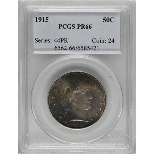 <B>1915 50C PR66 PCGS.</B></I> This is a truly lovely Premium Gem proof Barber half. The glittering surfaces reveal mildly frosted devices and highly reflective fields; the coin just barely misses qualifying for the coveted Cameo designation. Sharply struck and impressively preserved, with faint slide marks on Liberty's cheek that are noticed only under magnification. Population: 10 in 66, 4 finer (3/07).<BR><BR><b>Shipping:</b> Coins & Currency (<a target="_blank" href="http://www.heritageauctions.com/common/shipping.php">view shipping information</a>)