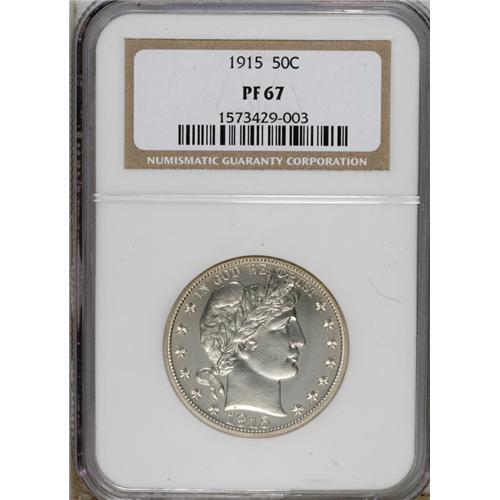 <B>1915 50C PR67 NGC.</B></I> Only 450 proofs were produced of this series-ending issue, complementing the low business strike emission of 138,000 coins. This delightful Superb Gem displays sharply struck surfaces that are essentially free of contrast, with a noteworthy lack of contact marks, large or small. Census: 12 in 67, 5 finer (4/07).<BR><BR><b>Shipping:</b> Coins & Currency (<a target="_blank" href="http://www.heritageauctions.com/common/shipping.php">view shipping information</a>)