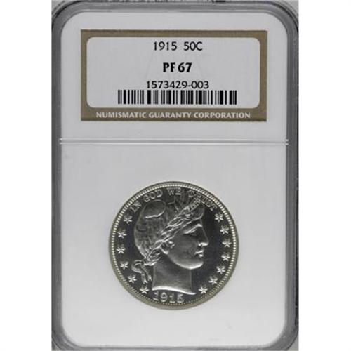 <B>1915 50C PR67 NGC.</B></I> Only 450 proofs were produced of this series-ending issue, complementing the low business strike emission of 138,000 coins. This delightful Superb Gem displays sharply struck surfaces that are essentially free of contrast, with a noteworthy lack of contact marks, large or small. Census: 12 in 67, 5 finer (6/07).<BR><BR><B>Coin Engraver:</B> Charles E. Barber<BR><BR><b>Shipping:</b> Coins & Currency (<a target="_blank" href="http://www.heritageauctions.com/common/shipping.php">view shipping information</a>\)