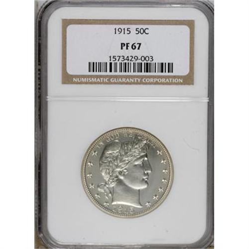 <B>1915 50C PR67 NGC.</B></I> Only 450 proofs were produced of this series-ending issue, complementing the low business strike emission of 138,000 coins. This delightful Superb Gem displays sharply struck surfaces that are essentially free of contrast, with a noteworthy lack of contact marks, large or small. Census: 12 in 67, 5 finer (10/07).<BR><BR><B>Coin Engraver:</B> Charles E. Barber<BR><BR><b>Shipping:</b> Coins & Currency (<a target="_blank" href="http://www.heritageauctions.com/common/shipping.php">view shipping information</a>)