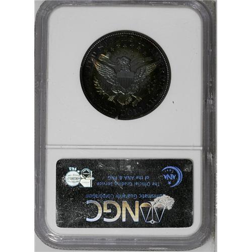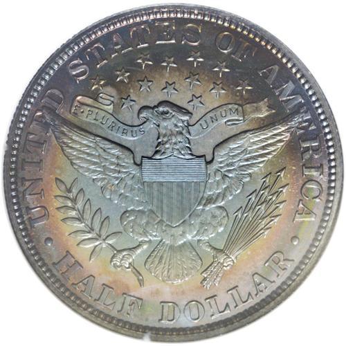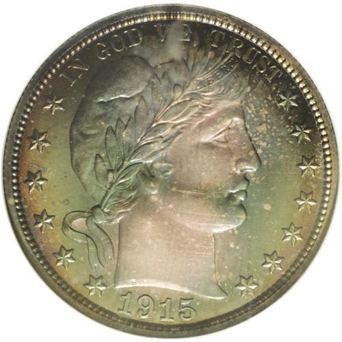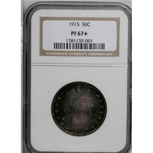 <B>1915<50C> PR67 <img border='0' src='http://www.heritagecoins.com/images/star.gif' width=10 height=10> NGC.</B></I> Granted NGC's coveted Star designation for superior eye appeal, this beautiful Superb Gem proof offers concentric rings of fuchsia, jade-green, and amber-gold on the obverse, with electric-blue, lemon-yellow, copper-gold, and aqua on the reverse. Radiant brilliance escapes unimpeded from beneath the translucent toning, and the surfaces lack any mentionable distractions, save for a few tiny obverse field hairlines. The strike is pleasingly bold. Amazingly, seven pieces have been graded finer at NGC (7/06).