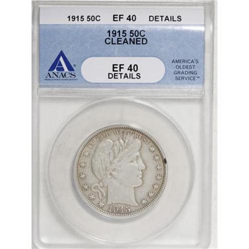 <B>1915 50C --Cleaned--ANACS. XF40 Details.</B></I> NGC Census: (1/53). PCGS Population (4/99). Mintage: 138,000. Numismedia Wsl. Price for NGC/PCGS coin in XF40: $429. (#6532)<BR><BR><B>Coin Engraver:</B> Charles E. Barber<BR><BR><b>Shipping:</b> Coins & Currency (<a target="_blank" href="http://www.heritageauctions.com/common/shipping.php">view shipping information</a>)