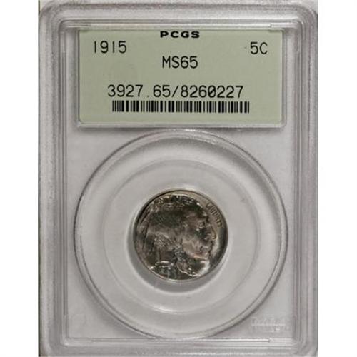 <B>1915 5C MS65 PCGS.</B></I> . PCGS Population (399/266). NGC Census: (275/85). Mintage: 20,987,270. Numismedia Wsl. Price for NGC/PCGS coin in MS65: $265. (#3927)<BR><BR><B>Coin Engraver:</B> James E. Fraser<BR><BR><b>Shipping:</b> Coins & Currency (<a target="_blank" href="http://www.heritageauctions.com/common/shipping.php">view shipping information</a>)