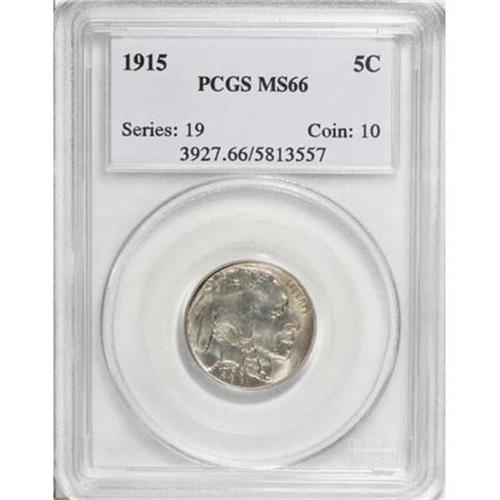 <B>1915 5C MS66 PCGS.</B></I> Pleasingly detailed and highly lustrous with waves of gold and orange patina over each side. An attractive example of this earlier issue, one that uses the original portrait on the obverse, unlike the pieces of 1916 and later.<BR><BR><B>Coin Engraver:</B> James E. Fraser<BR><BR><b>Shipping:</b> Coins & Currency (<a target="_blank" href="http://www.heritageauctions.com/common/shipping.php">view shipping information</a>)