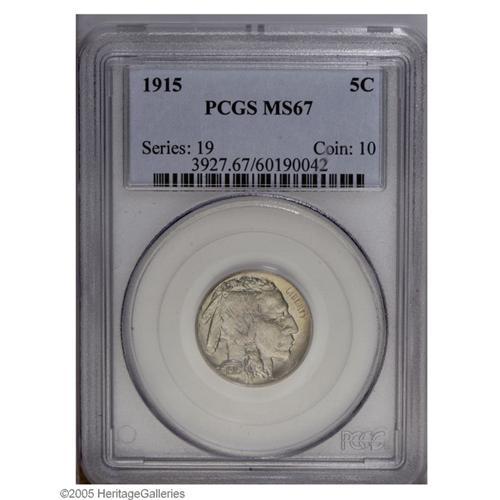 <B>1915<5C> MS67 PCGS.</B></I> The strike on this pristine Buffalo nickel is full, and both sides show a wonderful combination of natural toning shades. The centers show pastel rose-crimson color, fading to mint-green, then to subtle gold accents at the borders. A outstanding example of this well produced early P-mint. Population: 31 in 67, 0 finer (10/05).