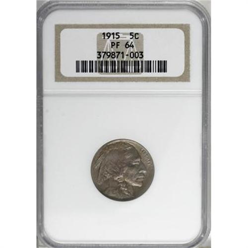 <B>1915 5C PR64 NGC.</B></I> David Lange, in his Buffalo nickels reference, indicates that the 1915 proof nickels were made with an eye to high quality. This is evident on the near-Gem specimen for sale in the current lot. The uniformly exquisite strike results in sharp definition on the motifs, and pastel beige-gold and powder blue patina rests on well preserved surfaces.<BR><BR><b>Shipping:</b> Coins & Currency (<a target="_blank" href="http://www.heritageauctions.com/common/shipping.php">view shipping information</a>)