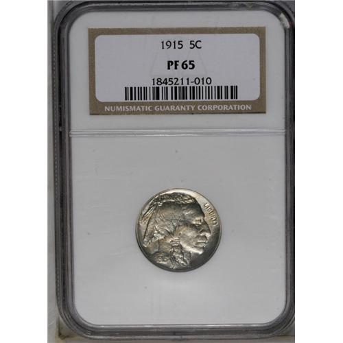<B>1915<5C> PR65 NGC.</B></I> Sharply struck on almost all of the design elements, with attractive variegated patina and impeccable surface preservation. A wispy die crack traverses the bison's midsection.