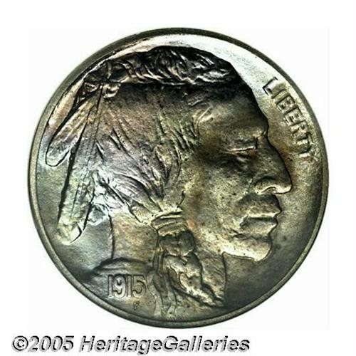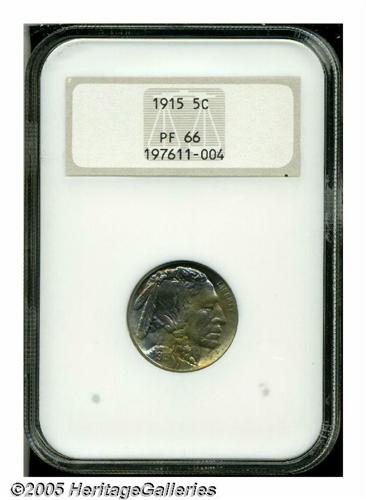 <B>1915<5C> PR66 NGC.</B></I> Expectantly sharp for the issue, this high quality specimen is needle sharp from rim to rim. There is some original, moderate intensity, lilac, deep gold, and ice-blue patina over both sides, all features of which are free of bothersome handling marks. A few scattered carbon speckles are mentioned for accuracy. The 1915 is somewhat more difficult to locate than the 1914, but it is still among the more frequently offered dates in the proof Buffalo Nickel series of 1913-1916.<BR><I>From The Clifford Columbus Collection.</B></I>