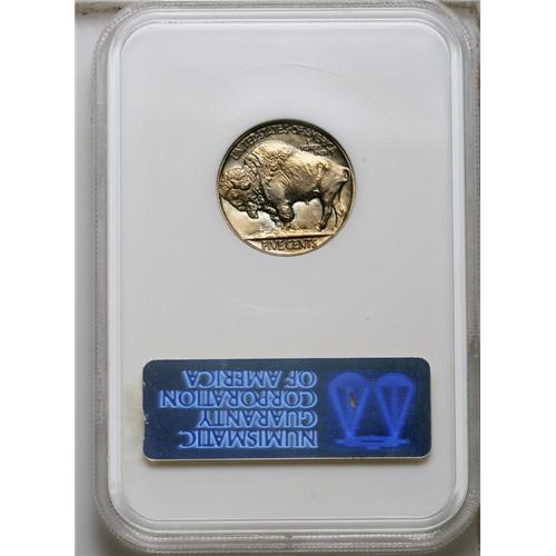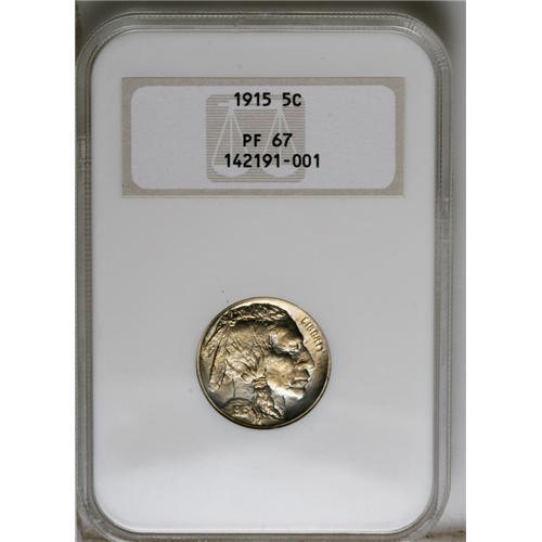 <B>1915 5C PR67 NGC.</B></I> Peach and ice-blue patina endow this beautiful and immaculate Superb Gem. The strike is needle-sharp, whether the focal point is the Indian's braid, the bison's tail, or the bison's hair. Certified in a prior generation NGC holder. Scarce in such quality, partly due to a low production of 1,050 pieces. Census: 33 in 67, 4 finer (10/06).<BR><I>From The James Paul Collection.</B></I><BR><BR><b>Shipping:</b> Coin/Currency (<a target="_blank" href="http://www.heritageauctions.com/common/shipping.php">view shipping information</a>)