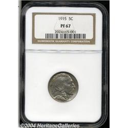 <B>1915<5C> PR67 NGC.</B></I> Boldly impressed with a pleasing satin-textured finish. Each side is accented in delicate lilac and golden-apricot patina and there is not even the slightest trace of carbon. Population: 27 in 67, 3 finer (4/04). <BR><BR><B>Important notice:</B> Heritage usually auctions material at the rate of 200-250 lots per hour. On some occasions eBay Live bid software or the Internet may not be able to keep up with the pace of the auction. We recommend placing a realistic absentee bid now as insurance to avoid disappointment. Occasionally the auctioneer may eliminate or reject an eBay Live bid, and the auctioneer may also reopen a lot after the close of the eBay live bidding (usually because we missed an audience bid), and may reject your bid even if it shows you as the winning bidder. By bidding via eBay Live, you agree that Heritage may award the lot to another bidder at its sole discretion under the circumstances described above or any other reasonable circumstances. Since eBay bids are not shown to us until we open the lot on the floor, we treat those bids just like floor bids. In most cases the floor responds before the eBay bid is presented to us, due to Internet lag time, so for consistency we have made it a policy that floor bids are always considered first over tie eBay live bids. Also please note that all Heritage lots purchased through eBay Live carry a 20% Buyer's Premium. Please make sure you read the Terms and Conditions before you bid.