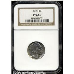<B>1915<5C> PR67 <S NGC.</B></I> The proof 1914 and 1915 Nickels are similar in striking quality with satin finished features and uniformly sharp striking definition. These issues, however, are not equal in rarity with the edge going to the 1915. The dominant feature on this proof is the vivid technicolor, "oil slick" toning that is draped over both sides. Carbon-free and showing the intricate detailing that only a proof can. Population: 29 in 67, 3 finer (6/04). <BR><BR><B>Important notice:</B> Heritage usually auctions material at the rate of 200-250 lots per hour. On some occasions eBay Live bid software or the Internet may not be able to keep up with the pace of the auction. We recommend placing a realistic absentee bid now as insurance to avoid disappointment. Occasionally the auctioneer may eliminate or reject an eBay Live bid, and the auctioneer may also reopen a lot after the close of the eBay live bidding (usually because we missed an audience bid), and may reject your bid even if it shows you as the winning bidder. By bidding via eBay Live, you agree that Heritage may award the lot to another bidder at its sole discretion under the circumstances described above or any other reasonable circumstances. Since eBay bids are not shown to us until we open the lot on the floor, we treat those bids just like floor bids. In most cases the floor responds before the eBay bid is presented to us, due to Internet lag time, so for consistency we have made it a policy that floor bids are always considered first over tie eBay live bids. Also please note that all Heritage lots purchased through eBay Live carry a 20% Buyer's Premium. Please make sure you read the Terms and Conditions before you bid. </span></font></tr></table></td></tr></table>