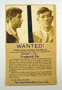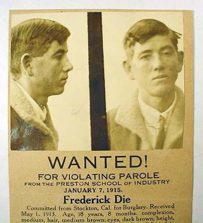 1915 ARREST NOTICE FOR MAN VIOLATING PAROLE - PRESTON SCHOOL OF INDUSTRY - Committed Burglary in Stocton, CA in 1913 when he was 18. Notice shows photo of man and description. Approx. 3.25" by 5.25"