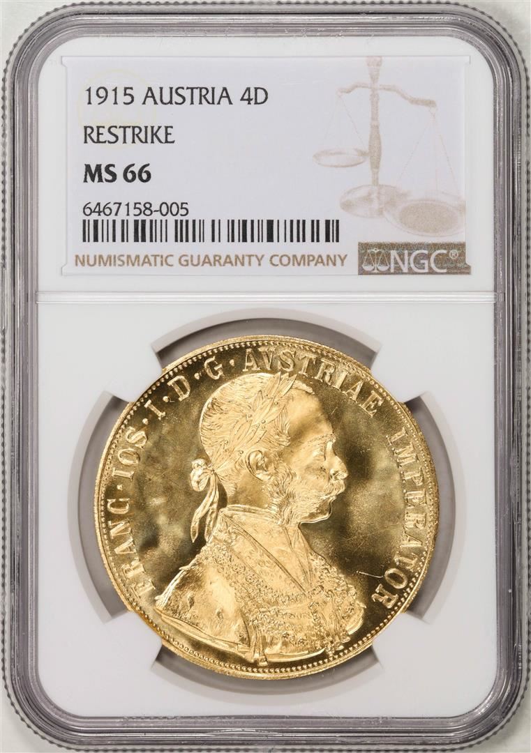 One 1915 Austria 4 Ducats Restrike Gold Coin NGC MS66 . NGC Certified.