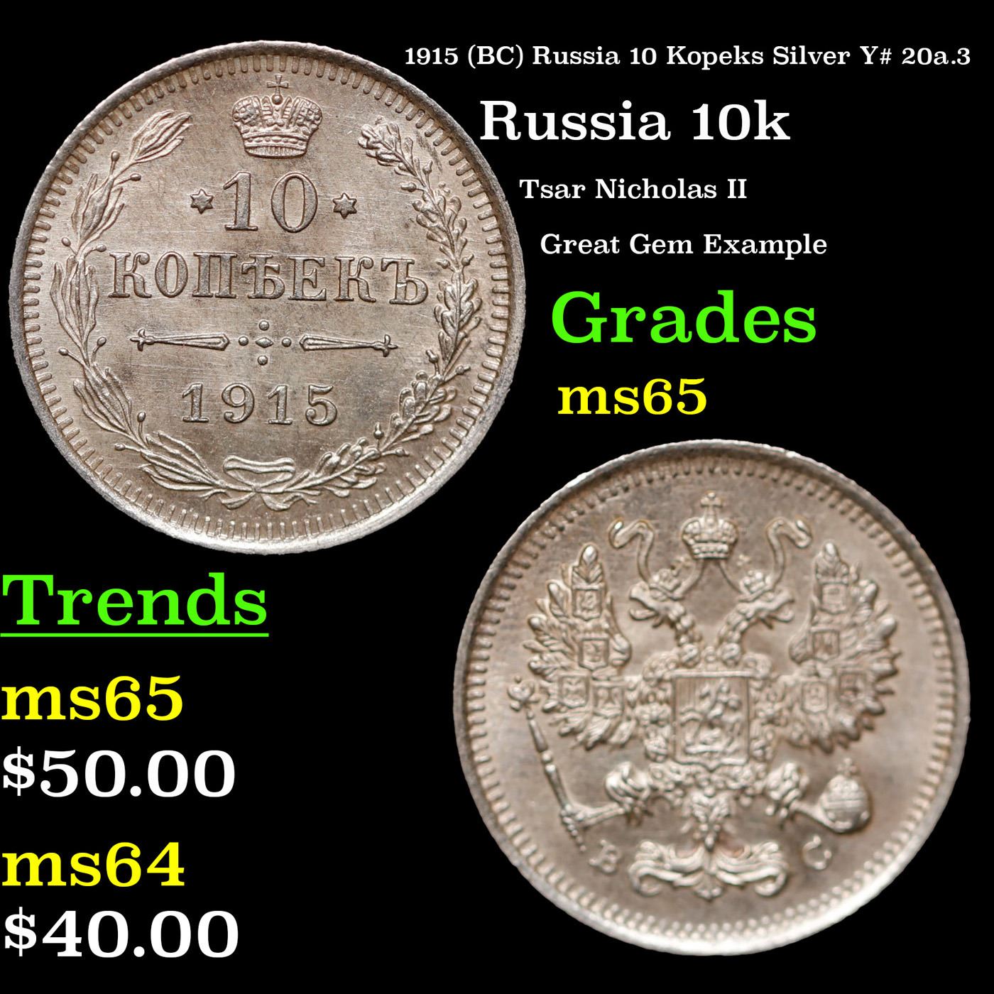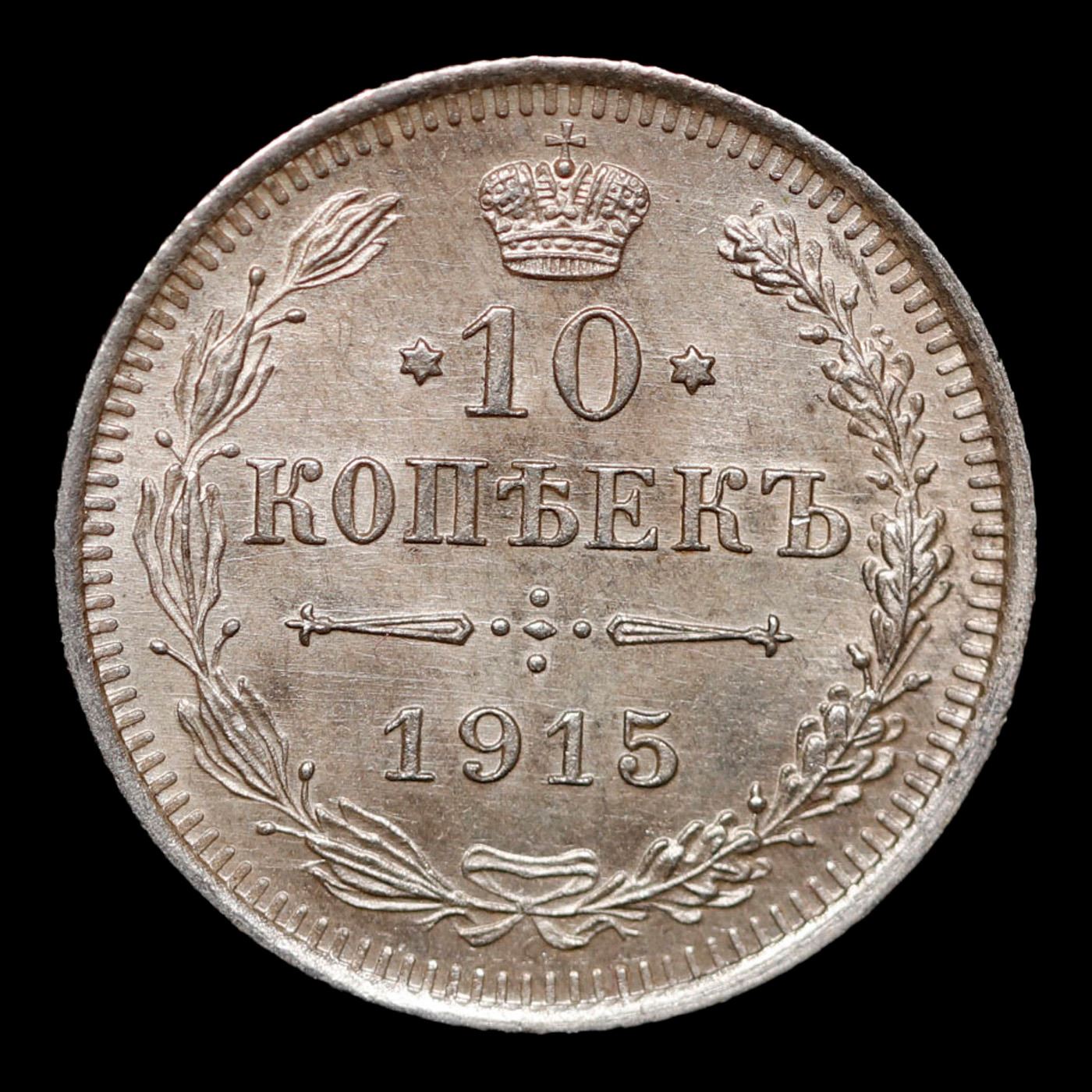 1915 (BC) Russia 10 Kopeks Silver Y# 20a.3 Grades GEM Unc.