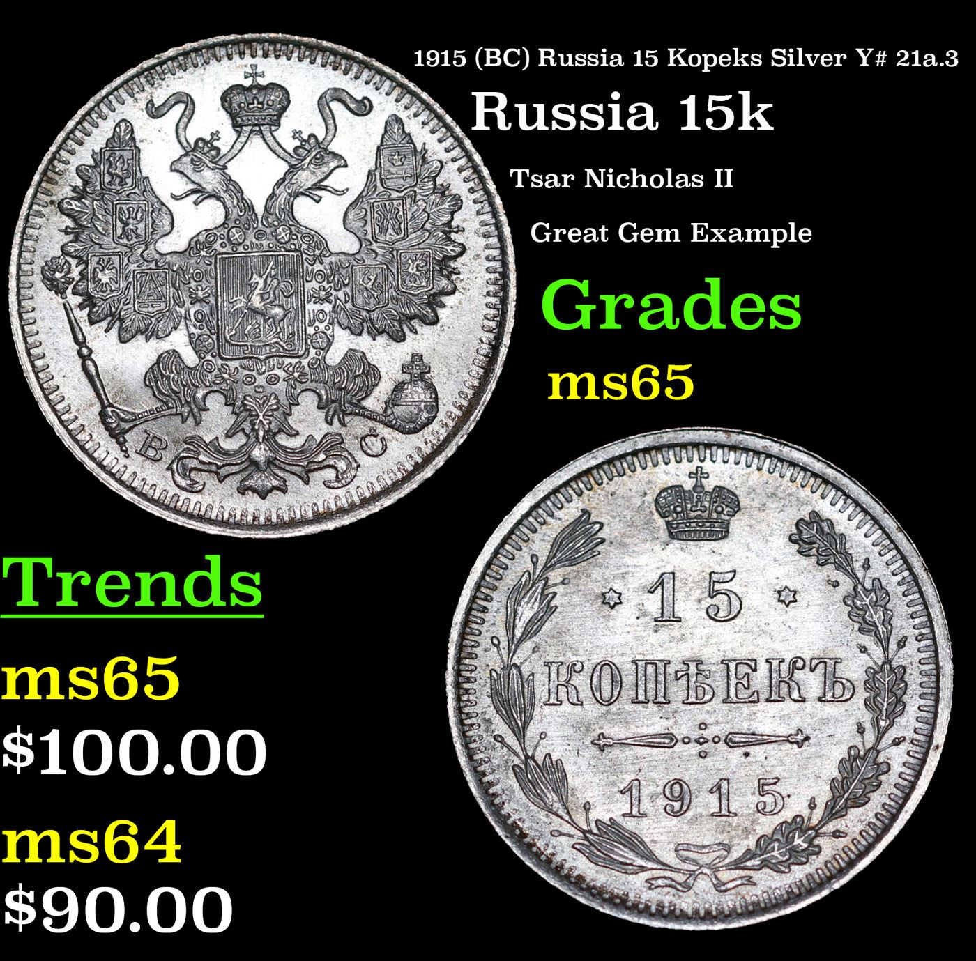 1915 (BC) Russia 15 Kopeks Silver Y# 21a.3 Grades GEM Unc.