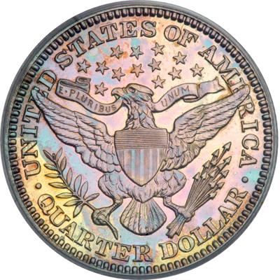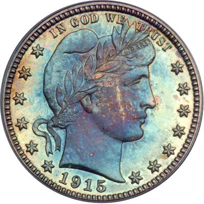 1915 Barber Quarter Dollar. PCGS graded Genuine Proof, questionable color. Our grade is Gem Proof-65 with gorgeous electric blue and violet across the obverse, violet and delicate golden hues on the reverse. From an old time collection and worth a premium bid for the stunning natural colors. Only 450 Proofs struck (PCGS # 5701) .