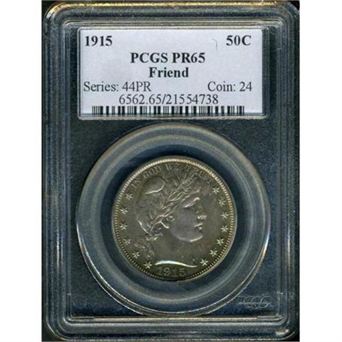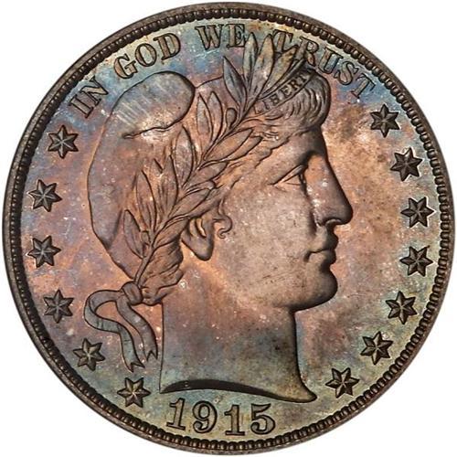 <b>1915 Barber Half Dollar. PCGS graded Proof 65.</b> Proof mintage was only 450 pieces. A fitting close to this session is the beautifully toned 1915 offered in this lot. The coin has all the attributes of its grade such as sharp relief, gem quality surfaces, and also includes two other qualities that set it above the average specimen: its toning and its aesthetic appeal. A collector who is in the frame of mind to own a fresh Barber half dollar in Proof condition, and who has a sudden ray of light revealed to him in the fact that this is just such a coin, will want to move close to the precipice and jump off with full confidence and a big bid <b>(PCGS # 6562)</b> <i>