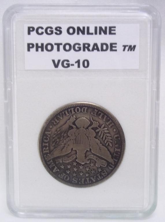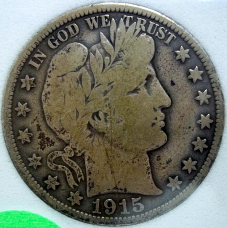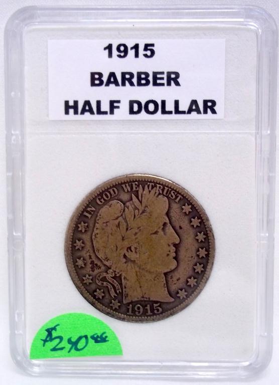 Key date 1915 Philadelphia Mint Barber Half Dollar, PCGS Online Photograde slabbed and certified Very Good-10. With a mintage of just 138,450, this is the second rarest coin in the entire Barber Half Dollar series.