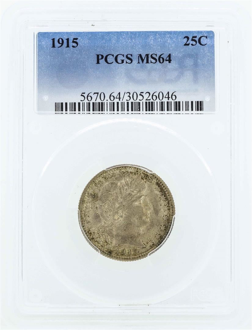 One 1915 Barber Silver Quarter Coin PCGS MS64. PCGS Graded.